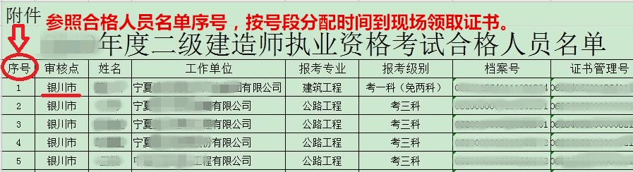 根據(jù)新冠肺炎疫情防控工作要求,為避免人員扎堆聚集,今年二級建造師合格證書發(fā)放將按照《自治區(qū)人力資源和社會保障廳 住房和城鄉(xiāng)建設(shè)廳關(guān)于公布2020年度二級建造師執(zhí)業(yè)資格考試合格標(biāo)準(zhǔn)及合格人員名單的通知》(文件下載網(wǎng)址:寧夏人事考試中心官網(wǎng)首頁左側(cè)合格人員欄目2020年合格人員)中銀川市合格人員名單序號,分時間、分號段進(jìn)行發(fā)放,具體安排如下: