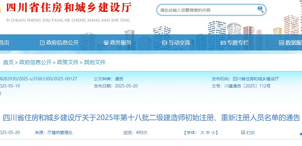 四川省住房和城鄉(xiāng)建設(shè)廳發(fā)布關(guān)于2025年第十八批二級建造師初始注冊、重新注冊人員名單的通告,具體內(nèi)容如下: