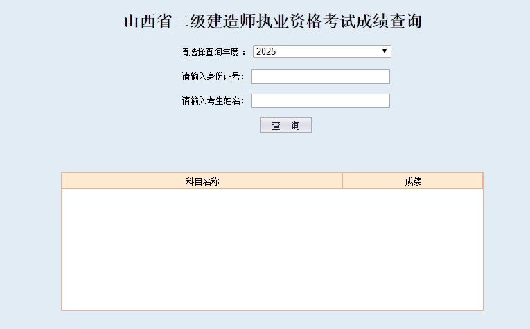 2025年山西二級建造師成績查詢?nèi)肟冢?/strong>http://39.97.9.165:8089/ej2025/30434/userhtml/user_cjcx.html