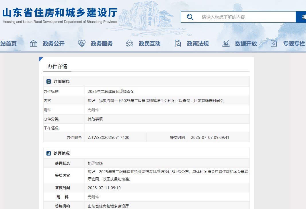 山東省住房和城鄉(xiāng)建設廳辦件詳情中指出:2025年度二級建造師執(zhí)業(yè)資格考試成績預計8月份公布,具體時間請關(guān)注省住房和城鄉(xiāng)建設廳官網(wǎng),以正式通知為準。具體信息如下: