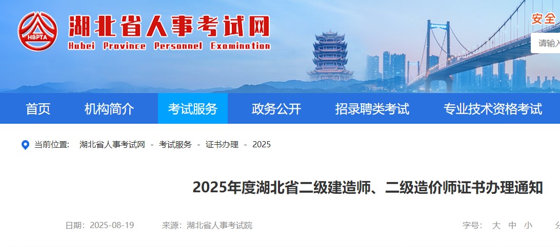 湖北省人事考試院發(fā)布2025年度湖北省二級建造師、二級造價師證書辦理通知,具體信息如下: