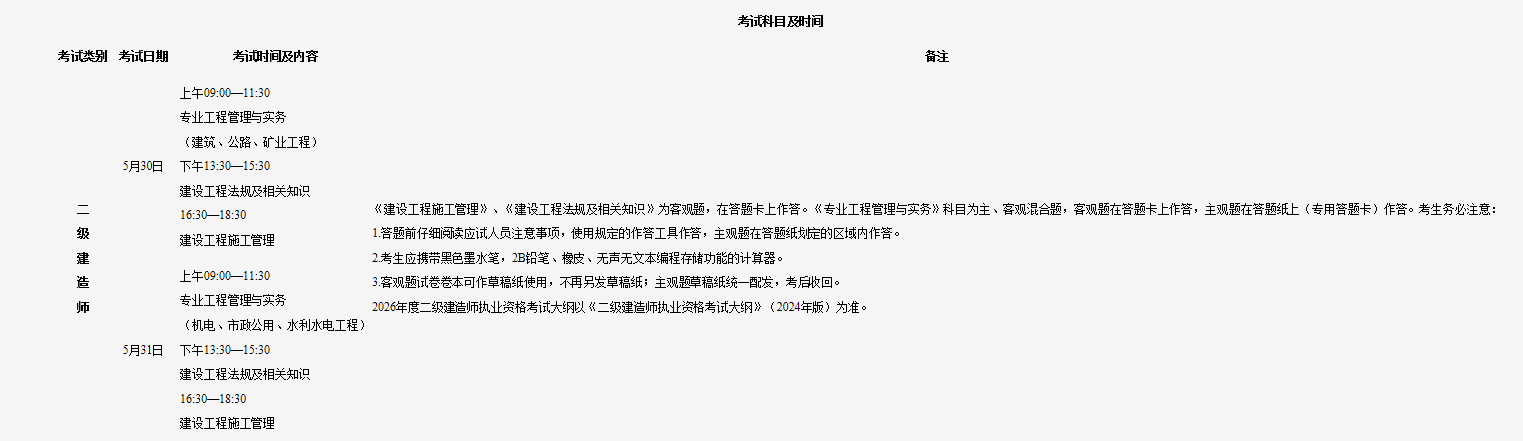 根據(jù)有關(guān)工作部署,2026年度二級(jí)建造師執(zhí)業(yè)資格考試定于5月30日、31日舉行。為做好我省2026年度二級(jí)建造師執(zhí)業(yè)資格考試考務(wù)工作,現(xiàn)將有關(guān)事項(xiàng)通知如下: