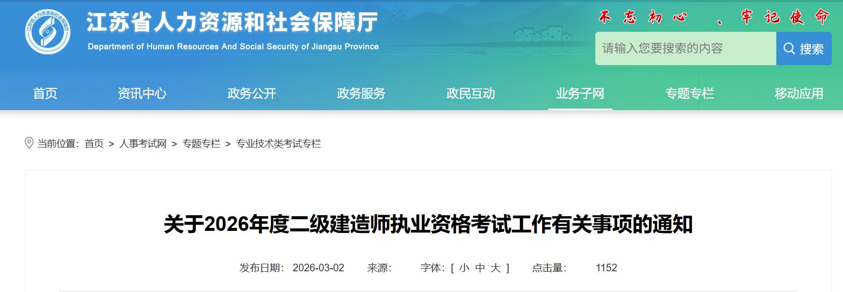 江蘇省人力資源和社會(huì)保障廳發(fā)布關(guān)于2026年度二級(jí)建造師執(zhí)業(yè)資格考試工作有關(guān)事項(xiàng)的通知,報(bào)名時(shí)間:2026年3月5日9:00至2 0日16:00,報(bào)名網(wǎng)站網(wǎng)址:江蘇人事考試網(wǎng)(http://jiangsu nomax.vip/tip/),繳費(fèi)時(shí)間為2026年3月5日至21日,準(zhǔn)考證打印時(shí)間:2026年5月25日至29日,考試時(shí)間:5月30日、31日,合格標(biāo)準(zhǔn):試卷滿分的60%(如有特殊情況,由長三角地區(qū)兩省一市協(xié)商劃定并另行通告),具體信息如下: