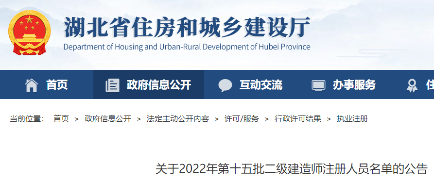 湖北關(guān)于2022年第十五批二級(jí)建造師注冊(cè)人員名單的公告