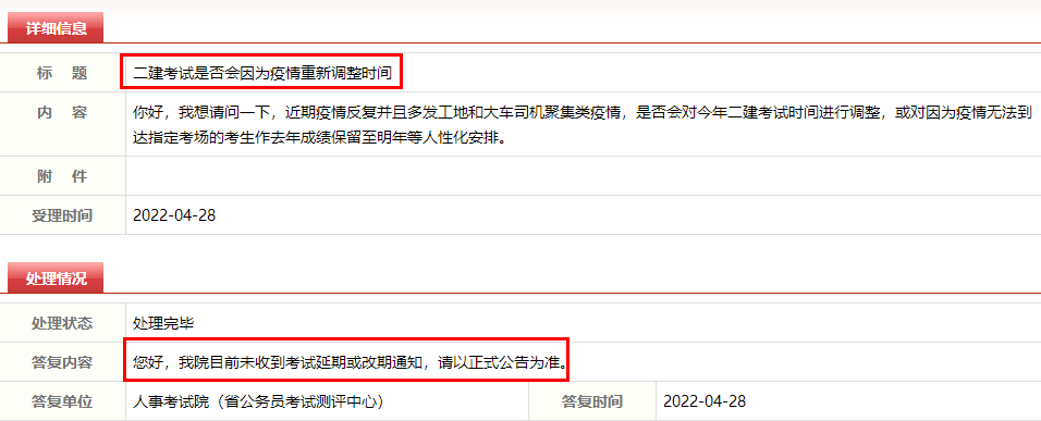 考生提問:你好,我想請問一下,近期疫情反復(fù)并且多發(fā)工地和大車司機聚集類疫情,是否會對今年二建考試時間進行調(diào)整,或?qū)σ驗橐咔闊o法到達(dá)指定考場的考生作去年成績保留至明年等人性化安排。