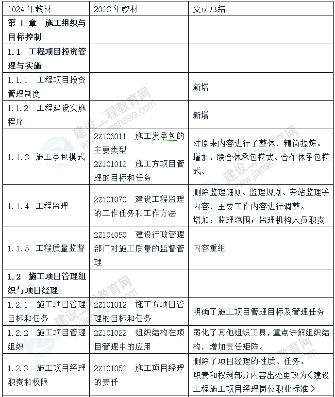 2024年二級(jí)建造師施工管理教材變動(dòng)情況表預(yù)覽