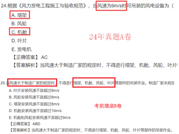 考點(diǎn)詳解:當(dāng)風(fēng)速大于制造廠家的規(guī)定時(shí),不得進(jìn)行塔架、機(jī)艙、風(fēng)輪、葉片等部件的吊裝作業(yè)。制造廠家未規(guī)定安裝風(fēng)速的,葉片和風(fēng)輪安裝風(fēng)速不宜超過(guò)8m/s,塔架、機(jī)艙安裝風(fēng)速不宜超過(guò)10m/s。