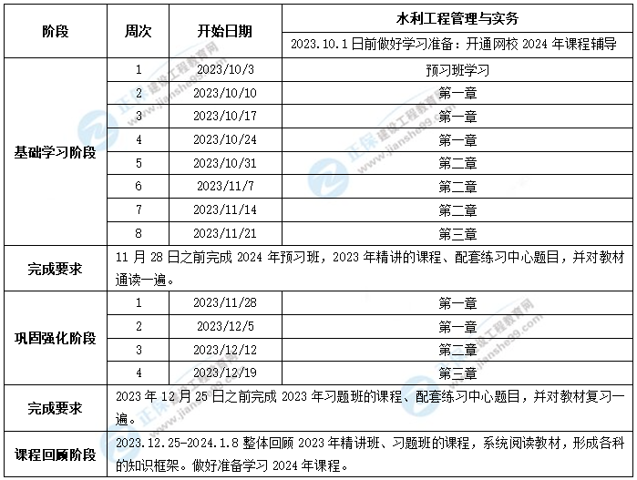 1、整體進(jìn)度說(shuō)明:本計(jì)劃表從2024年9月2日開(kāi)始執(zhí)行,計(jì)劃于2025年1月5日結(jié)束,共計(jì)18周;其中:基礎(chǔ)學(xué)習(xí)階段安排8周,鞏固強(qiáng)化階段安排8周,課程整體回顧階段安排2周。學(xué)員可根據(jù)本表的提示,結(jié)合自己的工作,學(xué)習(xí)情況進(jìn)行細(xì)化,并按網(wǎng)校要求完成聽(tīng)課、做題的學(xué)習(xí)任務(wù),基本可滿(mǎn)足考試需要。