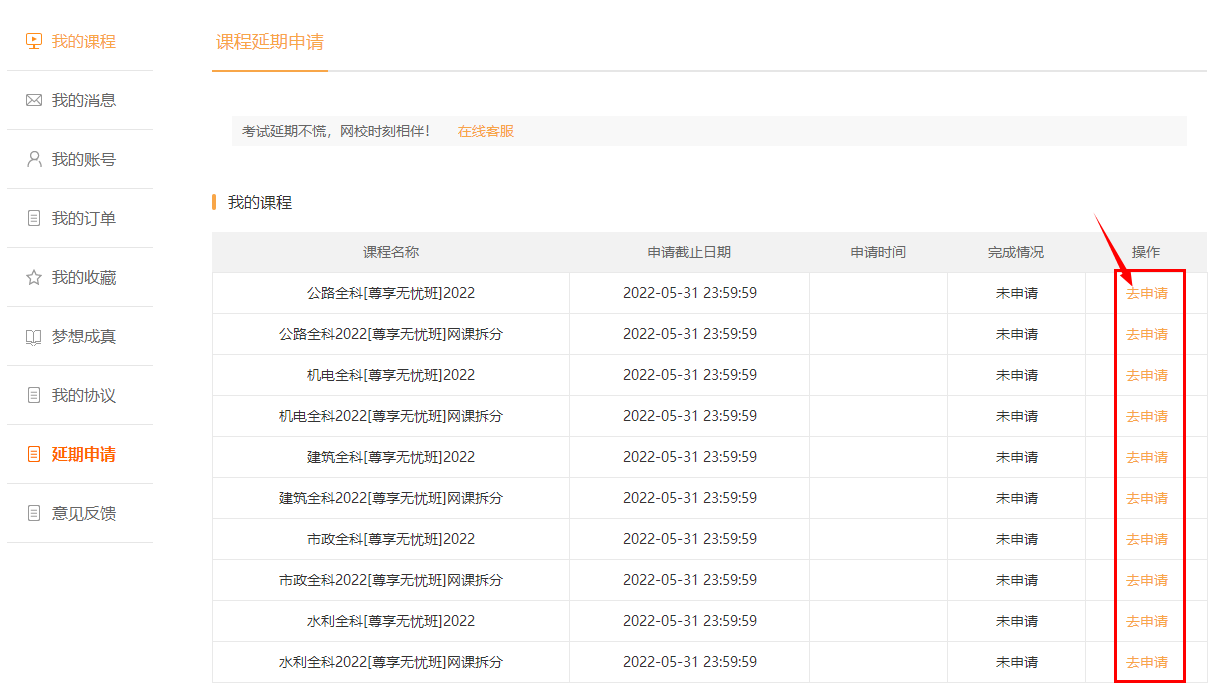之前在網(wǎng)校報過2022年二級建造師課程的北京考區(qū)的同學,可以申請課程延期,申請時間為:5月27日-6月20日00:00,入口在“我的網(wǎng)校我的家”,同學們及時提交申請,不要錯過了時間。
