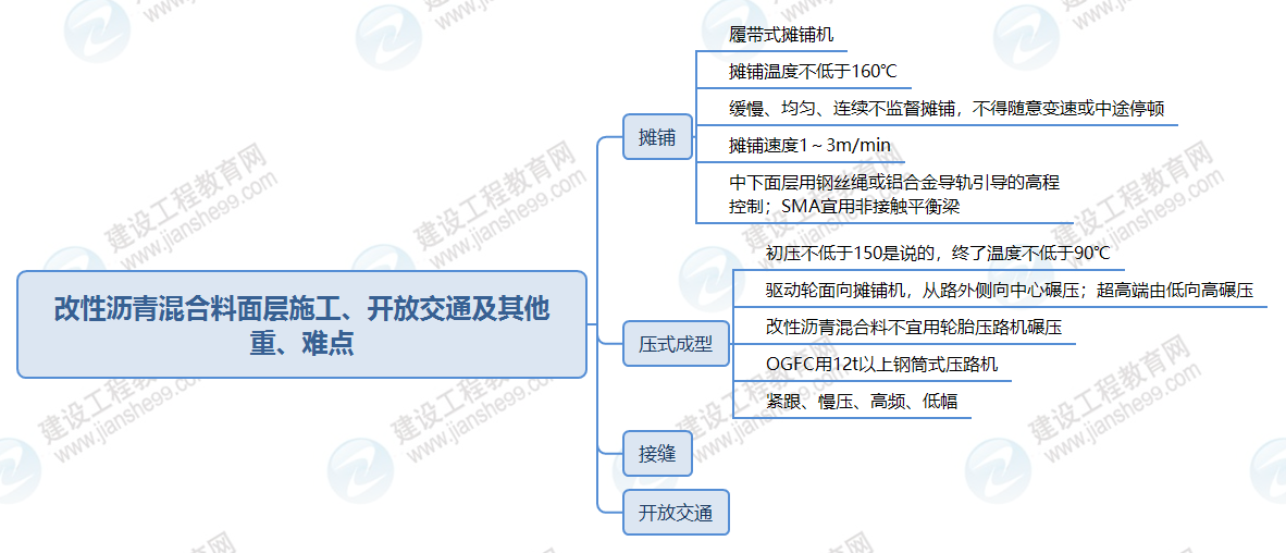 二建市政:改性瀝青混合料面層施工、開放交通及其他(思維導(dǎo)圖)