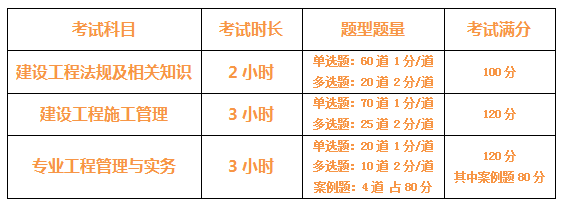 《建設(shè)工程法規(guī)及相關(guān)知識》考試時(shí)間為2小時(shí),《建設(shè)工程施工管理》考試時(shí)間為3小時(shí),《專業(yè)工程管理與實(shí)務(wù)》考試時(shí)間為3小時(shí)。