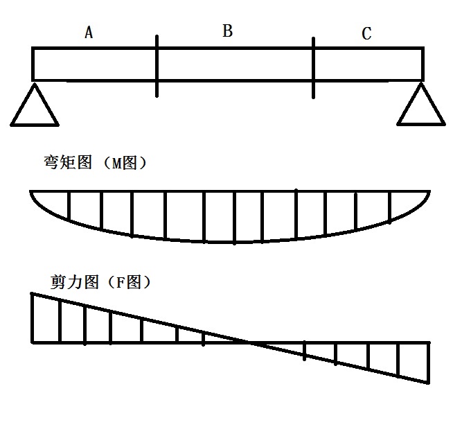 跨中的1/3范圍內(nèi),即是“B”區(qū)域的范圍內(nèi)。從上附剪力圖來看,簡支梁承受最大剪力的位置是支座附近的范圍,也就是“A”和“C”的區(qū)域。通過彎矩圖可以看出,簡支梁最大彎矩出現(xiàn)在跨中“B”區(qū)域內(nèi),擴展一下,鋼筋的接頭位置應當避開此區(qū)域,留設在“A”和“C”的區(qū)域。綜上所述,簡支梁的力學簡化模型中,混凝土的施工縫位置和受力鋼筋接頭留設位置恰恰相反,以此形成了混凝土和鋼筋互補之勢。