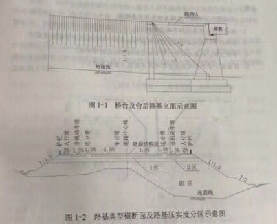 某公司承建一項(xiàng)路橋結(jié)合城鎮(zhèn)主干路工程,橋臺(tái)設(shè)計(jì)為重力式U型結(jié)構(gòu),基礎(chǔ)采用擴(kuò)大基礎(chǔ),持力層位于砂質(zhì)粘土層,地層中有少量潛水,臺(tái)后路基平均填土高度大于5米,場(chǎng)地地質(zhì)自上而下分別為腐殖土層,粉質(zhì)粘土層,砂質(zhì)粘土層,砂卵石層等。橋臺(tái)及臺(tái)后路基立面如圖1-1所示,路基典型橫斷面及路基壓實(shí)度分區(qū)如圖1-2所示。