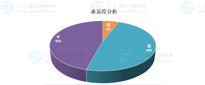 建設(shè)工程教育網(wǎng)對整體題目難易程度進行了劃分,其中劃定為“難”的是屬于歷年出題頻率很低不容易得分的考點,通過下圖可以看出難題并不是很多,根本影響不到通過成績,并且“易”和“中”難度等級的百分比例相差不多。