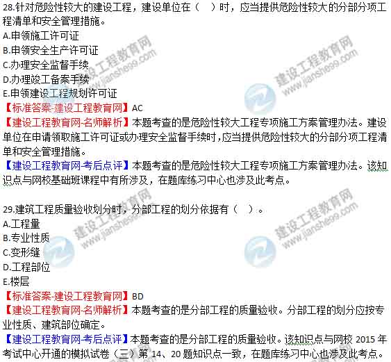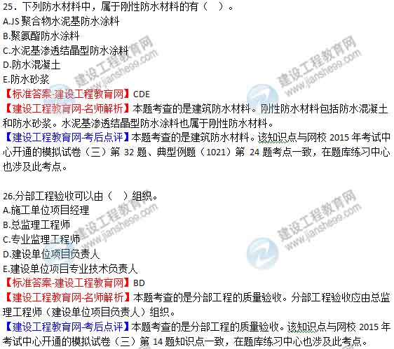 2015年二級建造師《建筑工程管理與實(shí)務(wù)》答案及解析由老師整理而成,部分網(wǎng)站未經(jīng)許可擅自轉(zhuǎn)載、抄襲,造成內(nèi)容有所缺失或錯誤,請大家以建設(shè)工程教育網(wǎng)發(fā)布為準(zhǔn)!2015二建試題答案解析