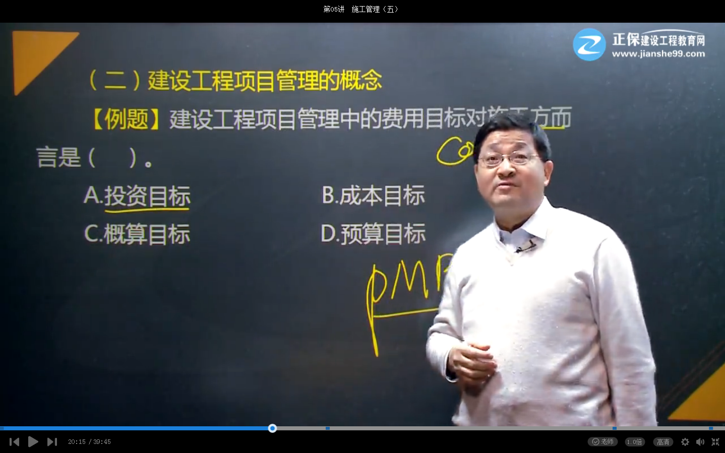 【答案解析】本題考查的是建設(shè)工程項目管理的類型。“費用目標”對業(yè)主而言是投資目標,對施工方而言是成本目標。參見教材P1。