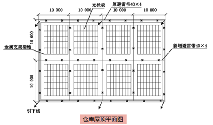 因光伏板安裝在倉庫屋面,倉庫建筑的防雷類別應(yīng)提高一個等級,建筑屋面需增加避雷帶(見圖3);光伏板用金屬支架固定,并接地可靠,20塊光伏板串聯(lián)成一個光伏直流發(fā)電回路,用2芯電纜接到直流匯流箱。項目部依據(jù)規(guī)范和設(shè)計要求編制了光伏發(fā)電工程的施工技術(shù)方案,并在施工前進(jìn)行了技術(shù)和安全交底。