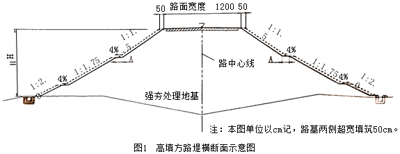 某施工單位承建了一段二級公路路基工程,其中K3+220~K3+650為高填方路堤。路基填方高度最高為21.2m,地面以下有約6m的軟土層。施工單位采用強(qiáng)夯處理地基,采用水平分層填筑路堤。高填方路堤橫斷面示意圖如圖1所示。