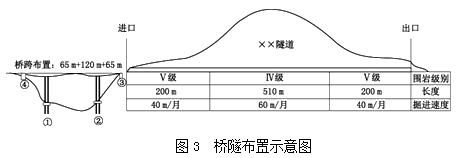 某施工單位承接了二級公路一橋隧相連項目,其中橋梁橋跨布置為(65+120+65)m,③號橋臺緊鄰隧道進口洞門。隧道全長910m,凈寬12m,凈高5m,單洞雙向兩車道,最大埋深100m,進、出口50m范圍內(nèi)埋深均小于20m(屬淺埋隧道)。橋跨布置與隧道圍巖級別及其長度、掘進速度見圖3所示。