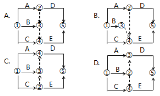 【例題】某工程有A、B、C、D、E五項工作,其邏輯關(guān)系為A、B、C完成后D開始,C完成后E才能開始,則據(jù)此繪制的雙代號網(wǎng)絡(luò)圖是( )。