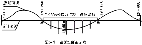 某段高速公路樁號為K0+000~K13+700,交通荷載等級為重交通。K9+362處有一座7×30m預(yù)應(yīng)力混凝土T型梁橋,橋梁造價(jià)1000萬元(含橋面鋪裝、交通安全設(shè)施等所有工程),K9+100~K9+600路線縱斷面示意圖見圖3-1。施工單位中標(biāo)進(jìn)場后,經(jīng)初步考察,擬組織下列機(jī)械進(jìn)場:A.挖掘機(jī);B.纜索式起重機(jī);C.羊足碾;D.旋挖鉆機(jī);E.架橋機(jī);F.打樁機(jī);G.平地機(jī);H.大噸位千斤頂;I.壓路機(jī);J.自卸汽車等。