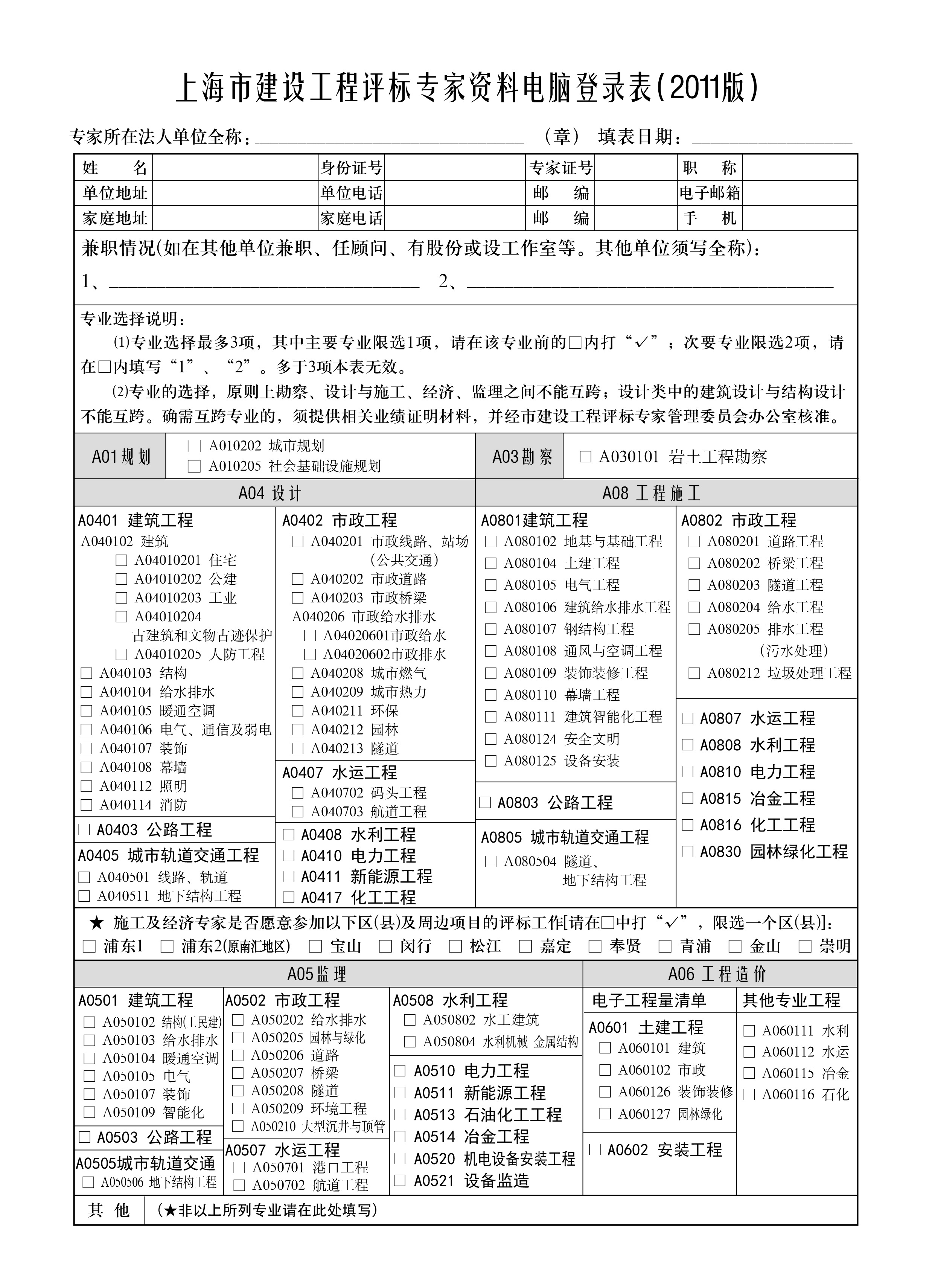 三、專業(yè)的選擇請詳閱說明。選擇超過3個專業(yè)的為無效表格;跨越不能互跨的專業(yè)須提供業(yè)績證明。市級施工及工程造價專業(yè)的專家愿意參加區(qū)(縣)項(xiàng)目評標(biāo)的,可在相應(yīng)區(qū)(縣)中勾選一項(xiàng)。區(qū)(縣)(專家證號開頭為SHC)的評標(biāo)專家可選專業(yè)限于“A08工程施工”類。