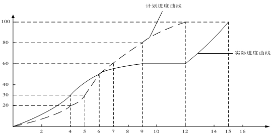 2. 第9月月底,實(shí)際進(jìn)度落后于計(jì)劃進(jìn)度,落后時(shí)間為2 個(gè)月。實(shí)際僅完成計(jì)劃進(jìn)度的75%。