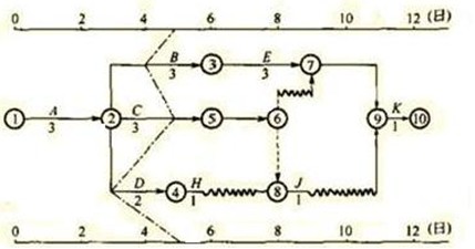 1、已知時標網(wǎng)絡計劃的前鋒線進行實際進度與計劃進度比較圖如圖所示,則( ?。?。