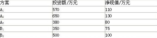 10、某企業(yè)計(jì)劃2008年投資兩個(gè)項(xiàng)目,項(xiàng)目A和項(xiàng)目B,項(xiàng)目A有3個(gè)備選方案:A1,A2,A3。項(xiàng)目B有2個(gè)備選方案:B1,B2。各個(gè)方案的投資額和凈現(xiàn)值如下表所示。所有被選方案計(jì)算期相同,基準(zhǔn)收益率為10%,若該企業(yè)的資金限額是1000萬(wàn),則應(yīng)選擇以下選項(xiàng)中的( )項(xiàng)目組合。