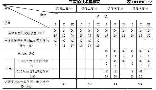2.石灰:石灰技術(shù)指標應(yīng)符合表1B412011-2的規(guī)定,應(yīng)盡量縮短石灰的存放時間。石灰在野外堆放時間較長時,應(yīng)覆蓋防潮。