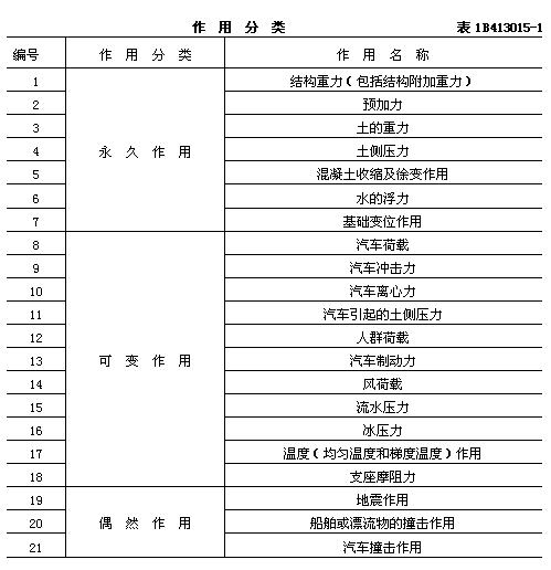公路橋涵設(shè)計(jì)采用的作用分為永久作用、可變作用和偶然作用三類,規(guī)定于表1B413015-1.
