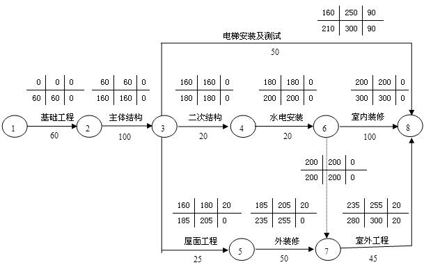 【答案解析】本題實(shí)質(zhì)就是計(jì)算該網(wǎng)絡(luò)計(jì)劃的工期。計(jì)算得到的最早開始時(shí)間、最早完成時(shí)間、最遲開始時(shí)間、最遲完成時(shí)間、總時(shí)差和自由時(shí)差。由圖可知計(jì)劃工期是300天。由于該網(wǎng)絡(luò)計(jì)劃圖較簡(jiǎn)單,也可以分別計(jì)算四條線路的持續(xù)時(shí)間,關(guān)鍵線路的長(zhǎng)就是計(jì)劃工期。參見教材P127.