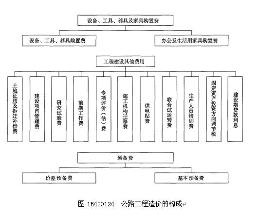 公路工程的造價是指公路工程交通基建、養(yǎng)護項目從籌備到竣工驗收交付使用所需的全部費用,由建筑安裝工程費,設(shè)備、工具(器具)購置費,工程建設(shè)其他費用,預(yù)備費四部分構(gòu)成(圖1B420124)。