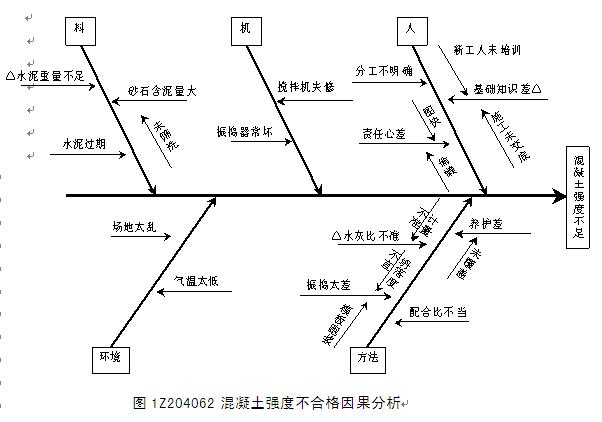 因果分析圖法,也稱為質(zhì)量特性要因分析法,其基本原理是對每一個質(zhì)量特性或問題,采用如圖1Z204062所示的方法,逐層深入排查可能原因,然后確定其中最主要原因,進(jìn)行有的放矢的處置和管理。