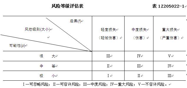 根據(jù)對危險源的識別,評估危險源造成的風(fēng)險可能性和大小,對風(fēng)險進(jìn)行分級。GB/T28002推薦的簡單的風(fēng)險等級評估如表1Z205022-1所示,結(jié)果分為Ⅰ、Ⅱ、Ⅲ、Ⅳ、Ⅴ五個風(fēng)險等級。通過評估,可對不同等級的風(fēng)險采取相應(yīng)的風(fēng)險控制措施。