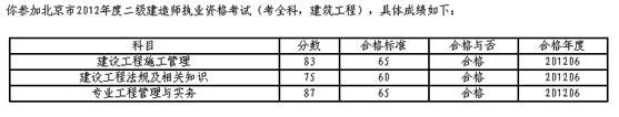 今年六月份參加北京市二級建造師考試(建筑專業(yè)),成績?nèi)缦拢?/p>