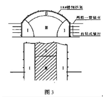 采用EX200反鏟挖掘、風鎬配合施工方法。首先用反鏟挖兩個拱角,兩側(cè)寬度小于3m,以反鏟能正常作業(yè)為準。其次滯后挖中間部分,使中間預留1.2~2m的施工平臺。這樣做的好處有二:一是預留部分對掌子面起一定支撐作用,防止掌子面坍塌,二是可代替腳手架,便于安裝拱架。開挖順序見圖3。