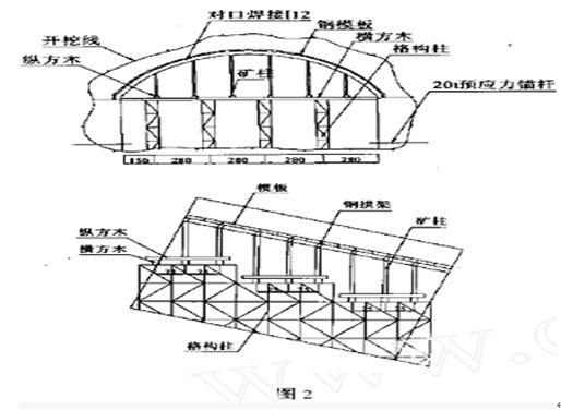 因F5斷層與一橫切洞室的高傾角無名斷層切割隧洞頂形成極不穩(wěn)定的三角體,首先在上半洞洞底兩側(cè)墻部位砌M1094×100cm漿砌石擋墻,插入鋼筋,澆筑C20混凝土。鋼拱架采用18#工字鋼加工制作,側(cè)墻模板采用常規(guī)辦法支撐加固,頂拱曲面混凝土模板采用14#槽鋼對口焊接彎制,模板支撐和頂拱支撐見圖2.待側(cè)墻拆模后,在兩側(cè)墻各布置18根Ф2520t級,孔深10.5m預應力錨桿。防止頂拱下滑。