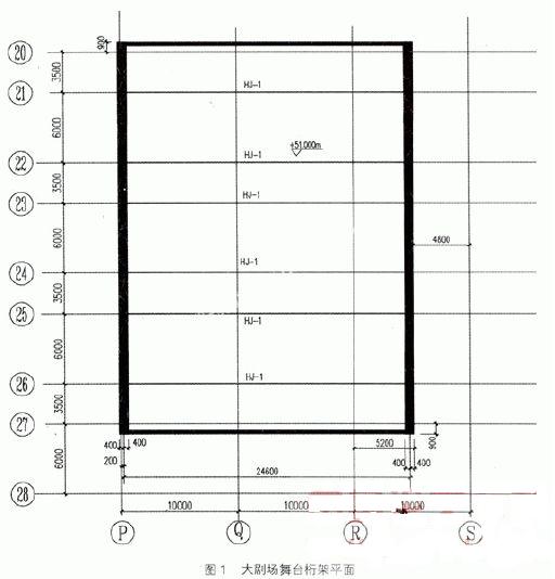 重慶大劇院工程項(xiàng)目總建筑面積103317m2,建筑高度64m,地上7層,地下2層,該工程結(jié)構(gòu)復(fù)雜,為筒體、框架、剪力墻加鋼結(jié)構(gòu)組成。該工程內(nèi)設(shè)大、中兩個(gè)劇場(chǎng),大中劇場(chǎng)舞臺(tái)均為砼筒體結(jié)構(gòu)。屋頂均為鋼桁架,鋼桁架擱置底標(biāo)高分別為46m、37m。大劇場(chǎng)舞臺(tái)桁架(GHJ-1)每榀長25.05m、高4.6m、自重20.3t,整體重量193t;中劇場(chǎng)舞臺(tái)桁架(GHJ-2)每榀長22.55m、高4.1m,自重17.1t,整體重量133t。桁架由工廠標(biāo)準(zhǔn)化制作,預(yù)拼后將中間腹桿切斷,上下弦桿各分兩段,再運(yùn)輸?shù)浆F(xiàn)場(chǎng)安裝。下面僅對(duì)大劇場(chǎng)予以介紹,桁架布置如圖1、2所示。