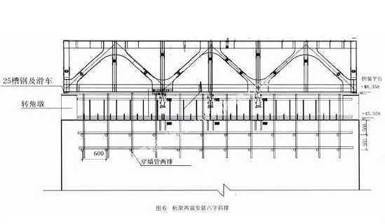 3.5在(27)軸搭設(shè)桁架對(duì)接三腳架懸挑拼裝平臺(tái),進(jìn)行桁架豎立拼裝,并同時(shí)在桁架兩端安裝八字斜撐,見圖5、6。
