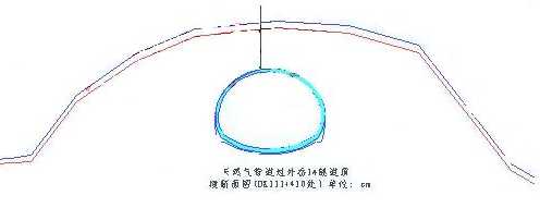 外岙一號隧道位于浙江省慈溪市茶亭南外岙自然村。隧道起訖里程:DK111+345~DK111+494,全長149m。經(jīng)過現(xiàn)場勘查,在外岙1#隧道山頂有一直徑Ф30cm的慈溪天然氣管道,該段天然氣管道設計壓力為4Mpa,管道在隧道線路里程DK111+410,方向大致與杭甬客專線路方向垂直。管道在山頂埋深約1.2m,距離DK111+410隧道斷面洞頂垂直距離約14m(附斷面圖)。進出口距離管道的距離分別為65m和84m。