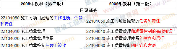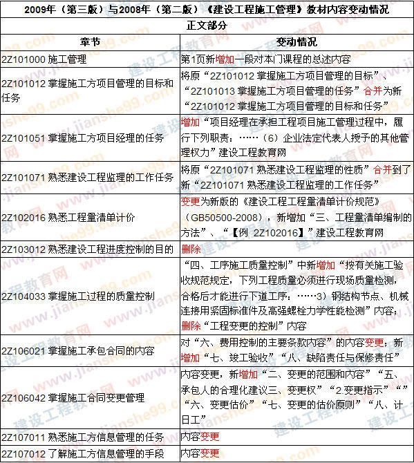 2009版教材將2008版教材的個(gè)別章節(jié)進(jìn)行了合并、刪除,在“2Z101051 掌握施工方項(xiàng)目經(jīng)理的任務(wù)”、“2Z104033 掌握施工過(guò)程的質(zhì)量控制”、“2Z106021 掌握施工承包合同的內(nèi)容”、“2Z106042 掌握施工合同變更管理”中的內(nèi)容進(jìn)行了補(bǔ)充和完善,對(duì)“2Z107011 熟悉施工方信息管理的任務(wù)”和“2Z107012 了解施工方信息管理的手段”等章節(jié)的內(nèi)容進(jìn)行了變更和調(diào)整。