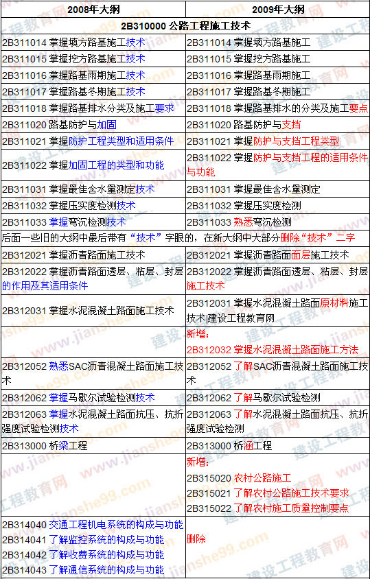 二級(jí)建造師考試大綱對(duì)比《公路工程專業(yè)》(09、08年)
