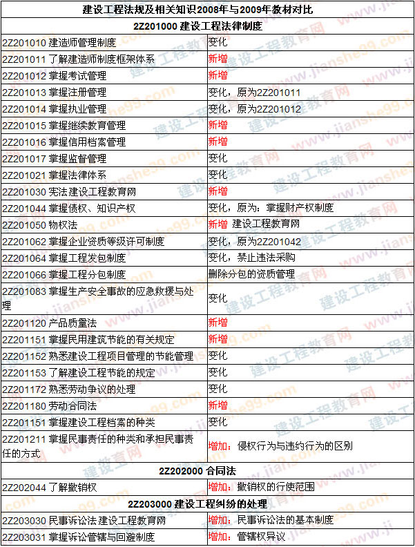 2009版教材增加憲法、物權(quán)法和勞動合同法三個法規(guī);刪除了執(zhí)業(yè)工程規(guī)模標(biāo)準(zhǔn)、勞動合同制度兩個內(nèi)容;建造師相關(guān)管理制度中增加了4節(jié)的內(nèi)容;節(jié)約能源法中增加了民用建筑節(jié)能的有關(guān)規(guī)定。來源:jianshe99,轉(zhuǎn)載請注明出處!