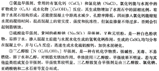 早強劑多用于搶修工程和冬季施工的混凝土。目前常用的早強劑有:氯鹽、硫酸鹽、三乙醇胺和以它們?yōu)榛A(chǔ)的復合早強劑。