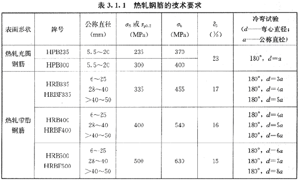 根據(jù)現(xiàn)行國家標(biāo)準(zhǔn)《鋼筋混凝土用熱軋光圓鋼筋》GB1499.1和《鋼筋混凝土用熱軋帶肋鋼筋》GBl499.2規(guī)定,熱軋光圓鋼筋分HPB235、HPB300兩種牌號,普通熱軋鋼筋分HRB335、HRB400、HRB500三種牌號,細(xì)晶粒熱軋鋼筋分HRBF335、HRBF400、HRBF500三種牌號。其中HPB235、HPB300鋼筋由碳素結(jié)構(gòu)鋼經(jīng)熱軋成型并自然冷卻,表面光圓,其余均由低合金高強(qiáng)度結(jié)構(gòu)鋼軋制而成,外表帶肋。帶肋鋼筋橫截面為圓形,長度方向有兩條軸對稱縱肋及均勻分布的橫肋,按肋紋的形狀分為月牙肋和等高肋。熱軋鋼筋的技術(shù)要求見表3.1.1.表中所列的強(qiáng)度值和伸長率均為要求的最小值。