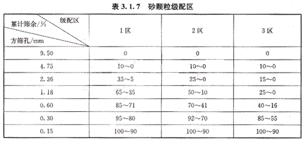 砂的顆粒級(jí)配用級(jí)配區(qū)表示,根據(jù)《建筑用砂》GB/T 14684規(guī)定,對(duì)細(xì)度模數(shù)為3.7~1.6的砂,按累計(jì)篩余百分率劃分為三個(gè)級(jí)配區(qū),見表3.1.7.混凝土用砂的顆粒級(jí)配應(yīng)處于表3.1.7中的任何一個(gè)級(jí)配區(qū)內(nèi),表中所列的累計(jì)篩余百分率,除4.75mm和0.50mm篩號(hào)外,允許稍有超出分界線,其總量不大于5%。