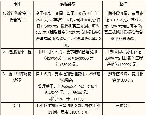 【解答】備注中的額外工程產(chǎn)值180000元應(yīng)該是已知條件,題目中承包單位未按已知該條件來計算工期,而是按實際拖延工期6周進行要求索賠,正確的索賠工期應(yīng)該是180000÷(4200000÷70)=3周按產(chǎn)量定額來計算應(yīng)該索賠的工期的。