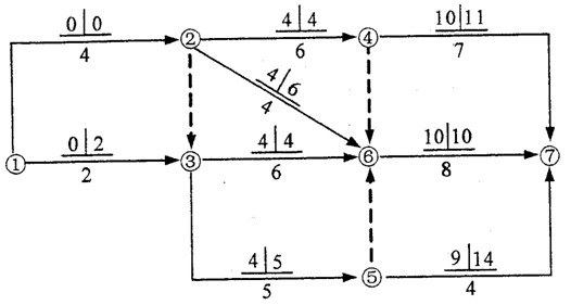 114.某工程雙代號網(wǎng)絡(luò)計(jì)劃如下圖所示,圖中已標(biāo)出每項(xiàng)工作的最早開始時間和最遲開始時間,該計(jì)劃表明( ?。?。