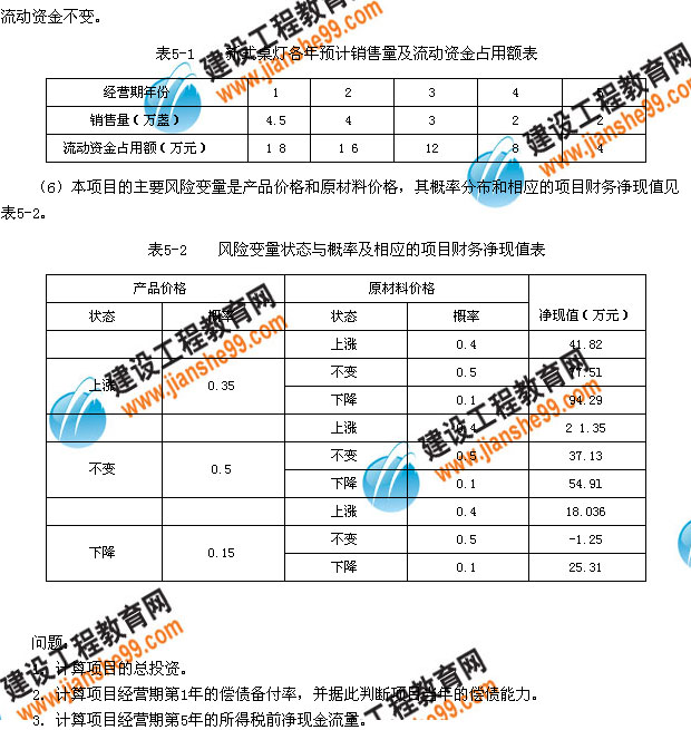 (5)項(xiàng)目經(jīng)營(yíng)期各年銷售量及流動(dòng)資金占用額見表5-1。為計(jì)算簡(jiǎn)便,假設(shè)生產(chǎn)標(biāo)準(zhǔn)桌燈占用的